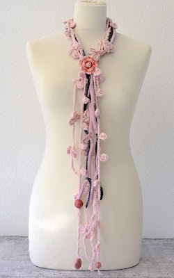 Io, ho utilizzato questo meraviglioso filato ( 100% pura lana vergine certificata ) per creare questa sciarpa/collana,una cascata di fiori rosa che può essere indossata in più modi.